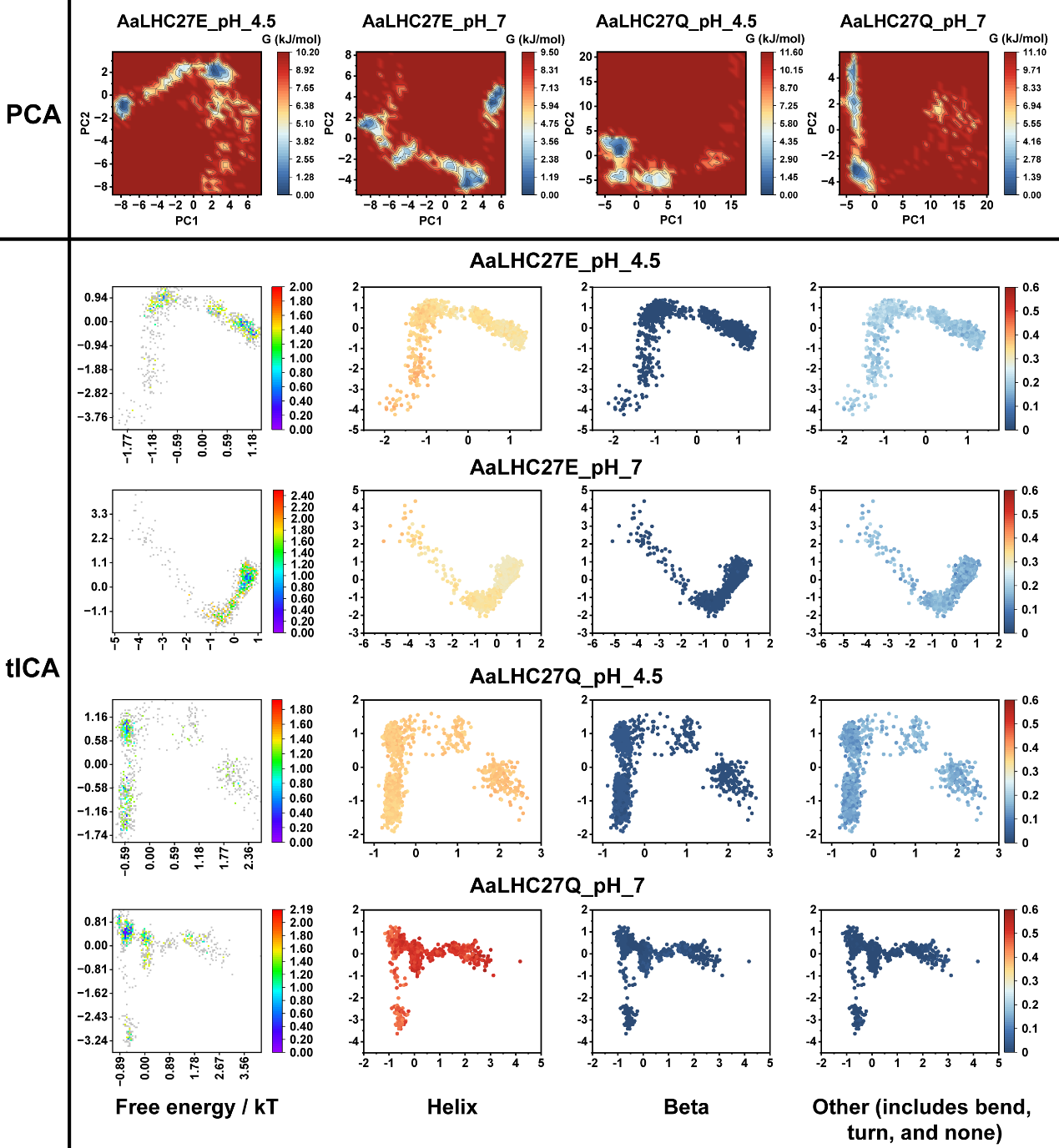 研究團隊將含有這兩個谷氨酸的蛋白基因轉(zhuǎn)入模式硅藻中跨物種表達。結(jié)果發(fā)現(xiàn),轉(zhuǎn)入正常基因的藻類在強光下NPQ顯著增強,生長更好;而將谷氨酸突變后,這一優(yōu)勢消失,證實了這兩個氨基酸在光保護中的關(guān)鍵作用。此外,通過體外純化蛋白的結(jié)構(gòu)生物學(xué)分析與分子動力學(xué)模擬,同樣驗證了這類關(guān)鍵蛋白的調(diào)控功能特征。