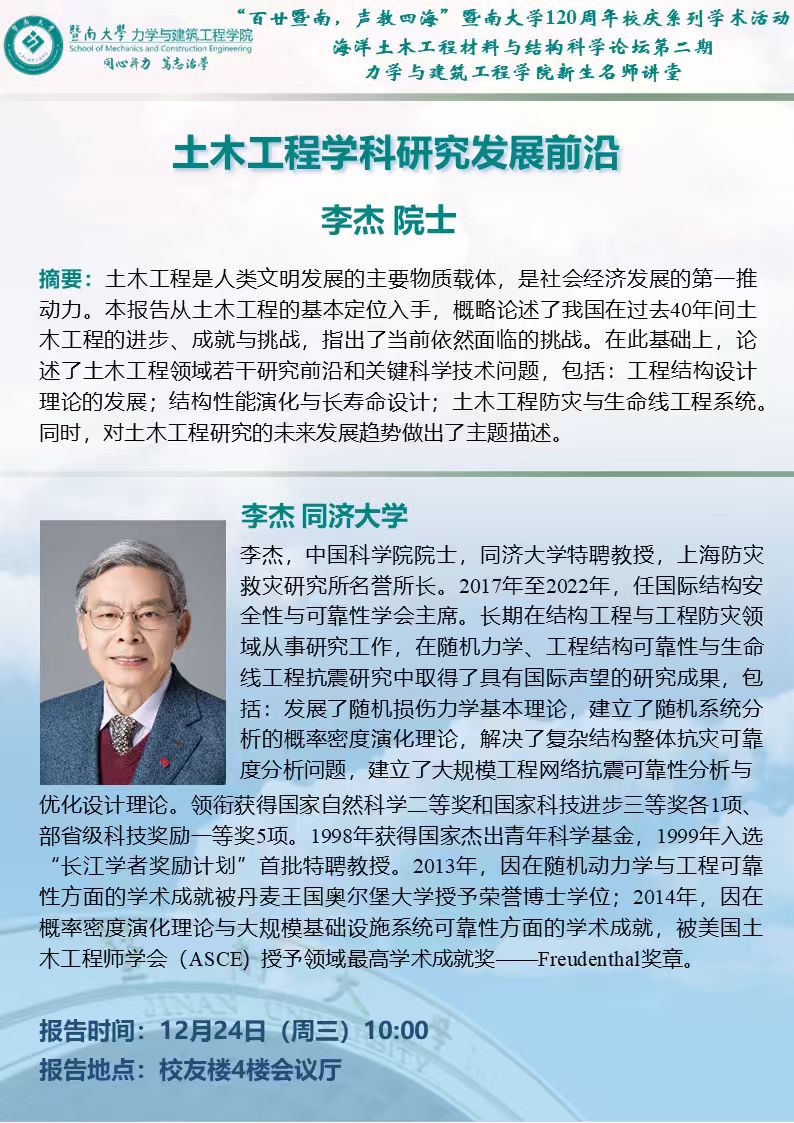【百廿暨南,聲教四?!啃c系列學(xué)術(shù)活動(dòng)(十)——中國科學(xué)院院士李杰:土木工程學(xué)科研究發(fā)展前沿