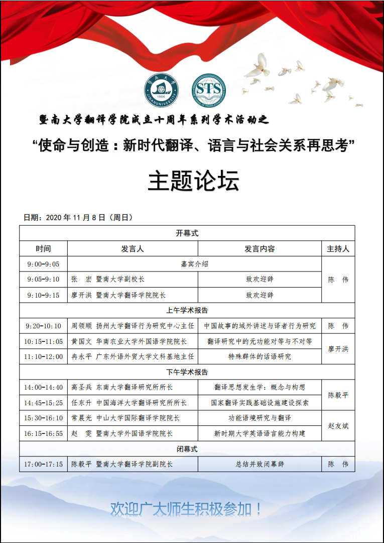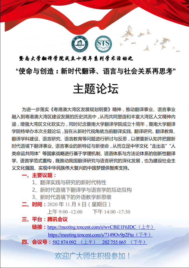 暨南大學(xué)翻譯學(xué)院成立十周年系列學(xué)術(shù)活動之“使命與創(chuàng)造:新時代翻譯、語言與社會關(guān)系再思考”