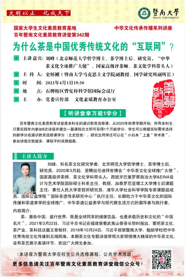 百年暨南文化素質(zhì)教育講堂第342期:為什么茶是中國(guó)優(yōu)秀傳統(tǒng)文化的“互聯(lián)網(wǎng)”?
