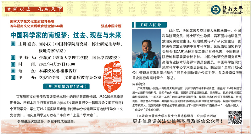 百年暨南文化素質(zhì)教育講堂第344期:中國(guó)科學(xué)家的南極夢(mèng):過去丶現(xiàn)在與未來