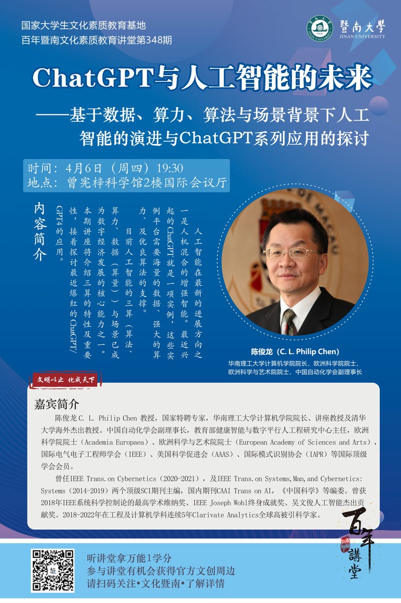 百年暨南文化素質(zhì)教育講堂第348期:陳俊龍:ChatGPT與人工智能的未來(lái) ——基于數(shù)據(jù)、算力、算法與場(chǎng)景背景下人工智能的演進(jìn)與ChatGPT系列應(yīng)用的探討