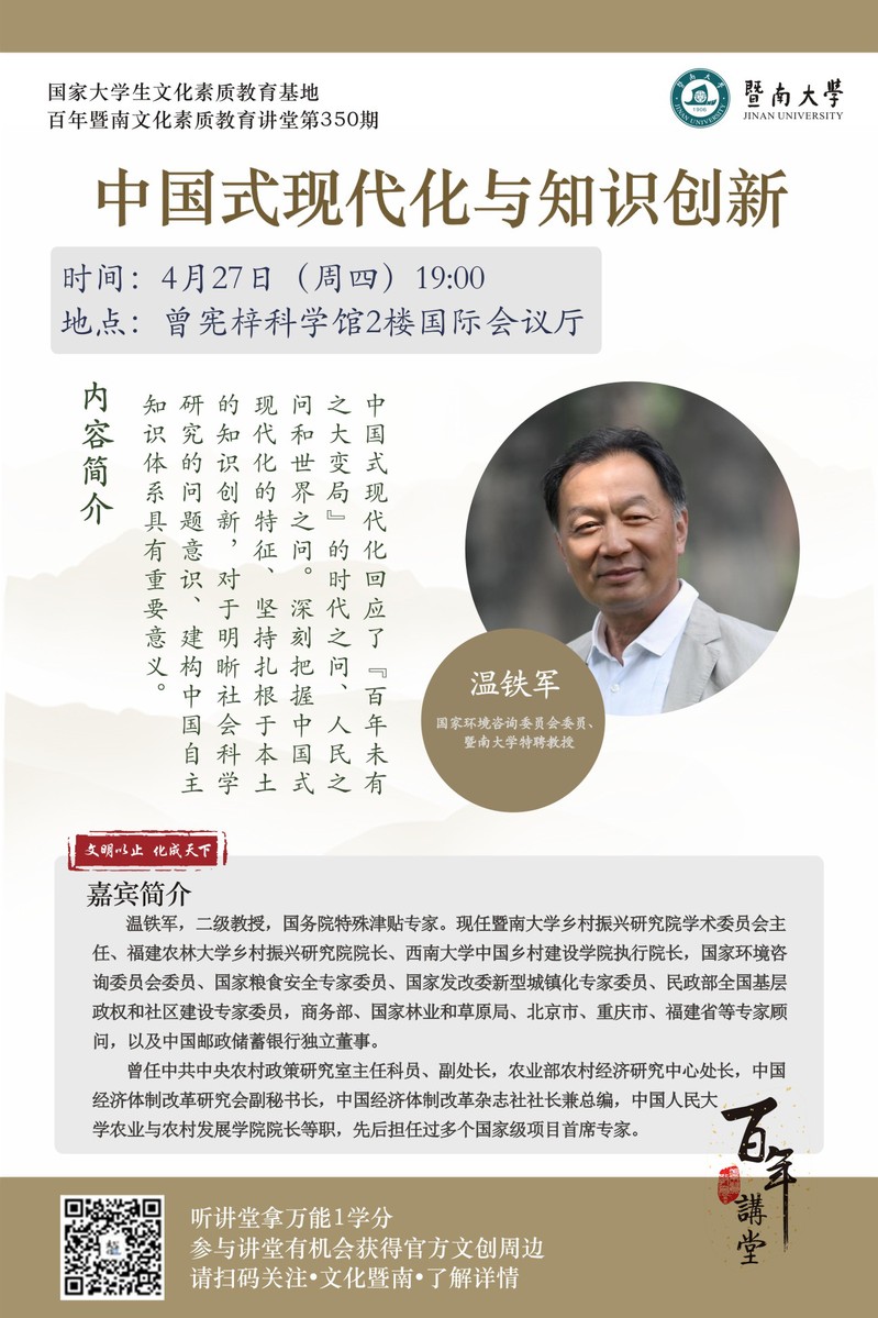 百年暨南文化素質(zhì)教育講堂第350期:溫鐵軍:中國(guó)式現(xiàn)代化與知識(shí)創(chuàng)新