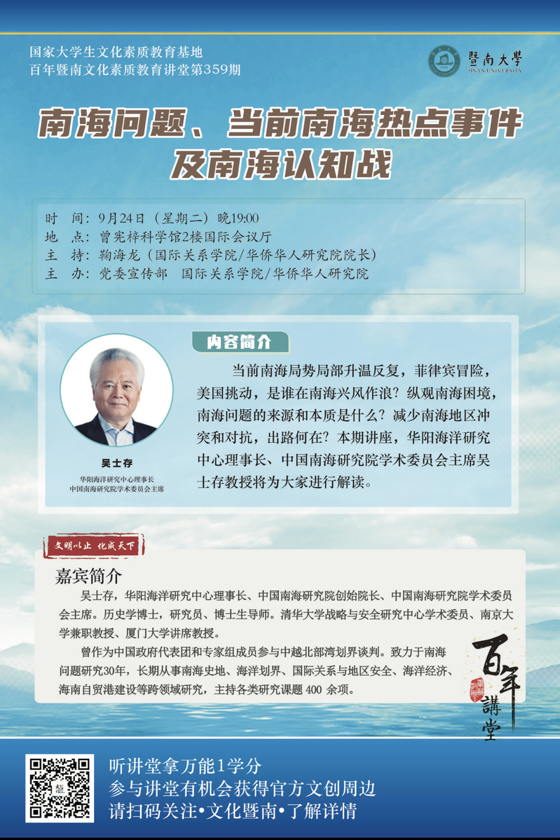 百年暨南文化素質(zhì)教育講堂第359期:吳士存:南海問題、當(dāng)前南海熱點(diǎn)事件及南海認(rèn)知戰(zhàn)