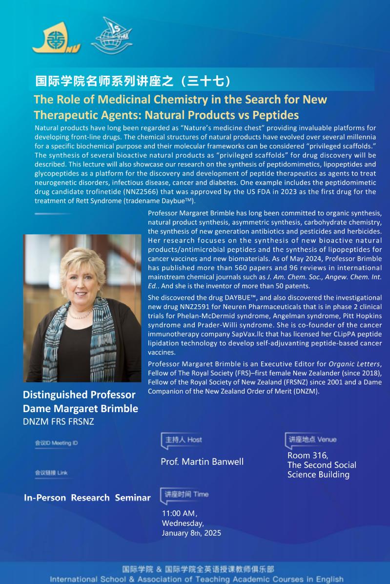 瑪格麗特·布林布爾教授是化學(xué)一區(qū)期刊Organic Letters執(zhí)行主編、2018年當(dāng)選英國(guó)皇家學(xué)會(huì)院士(新西蘭第一位獲此殊榮的女性科學(xué)家)、新西蘭皇家科學(xué)院院士(2001年當(dāng)選),新西蘭功績(jī)勛章獲得者(女爵)?,敻覃愄亍げ剂植紶柦淌陂L(zhǎng)期致力于天然產(chǎn)物全合成、新一代抗生素和疫苗合成、碳水化合物化學(xué)研究,特別是新型生物活性天然產(chǎn)物/抗菌肽的合成及其在醫(yī)藥領(lǐng)域中的應(yīng)用。截止2024年5月,瑪格麗特·布林布爾教授在國(guó)際頂級(jí)化學(xué)期刊如J. Am. Chem. Soc., Angew. Chem. Int. Ed.等以通訊作者身份共計(jì)發(fā)表發(fā)表了560多篇論文、96篇評(píng)論,授權(quán)發(fā)明專利50余項(xiàng)。