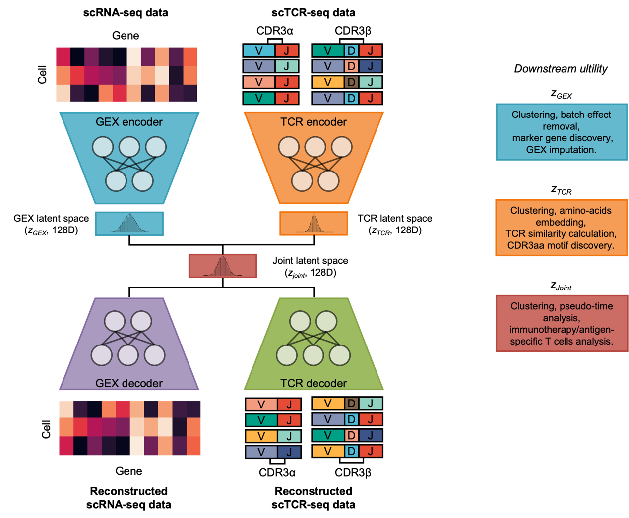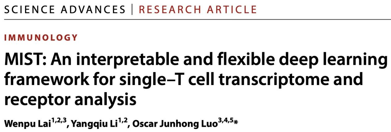 暨南大學(xué)融媒體中心訊 近日,暨南大學(xué)基礎(chǔ)醫(yī)學(xué)與公共衛(wèi)生學(xué)院羅鈞洪團(tuán)隊(duì)在Science子刊Science Advances發(fā)表題為“MIST:an interpretable and flexible deep learning framework for single-T cell transcriptome and receptor analysis”的研究成果。該研究基于變分自編碼器(Variational Autoencoder)深度學(xué)習(xí)框架開發(fā)了人工智能模型MIST(Multi-Insight for T cell),針對scRNA-seq與scTCR-seq數(shù)據(jù)的聯(lián)合分析,創(chuàng)新性地構(gòu)建了跨組學(xué)數(shù)據(jù)深度融合、可解釋性和適配性強(qiáng)的分析框架。該模型通過獨(dú)立的轉(zhuǎn)錄組、TCR序列和聯(lián)合潛變量空間三層嵌入,精準(zhǔn)解析了T細(xì)胞的功能狀態(tài)、克隆擴(kuò)增模式及抗原特異性,克服現(xiàn)有方法在組學(xué)數(shù)據(jù)整合和生物學(xué)可解釋性方面的局限,為深入解析免疫系統(tǒng)提供了強(qiáng)大工具。