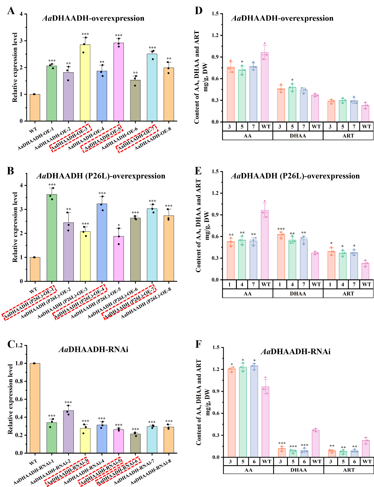 本研究在酶功能驗證中不僅建立異源表達體系(大腸桿菌和本氏煙草),還將候選基因在內源宿主(黃花蒿細胞)中進行功能驗證,該方法更接近酶的天然催化環(huán)境,可以真實反映其生理作用,彌補了異源表達系統的不足。同時,過表達和RNAi干擾實驗的結果相互印證,進一步確證了AaDHAADH在催化AA/DHAA轉化和ART生物合成中的關鍵作用(圖2)。