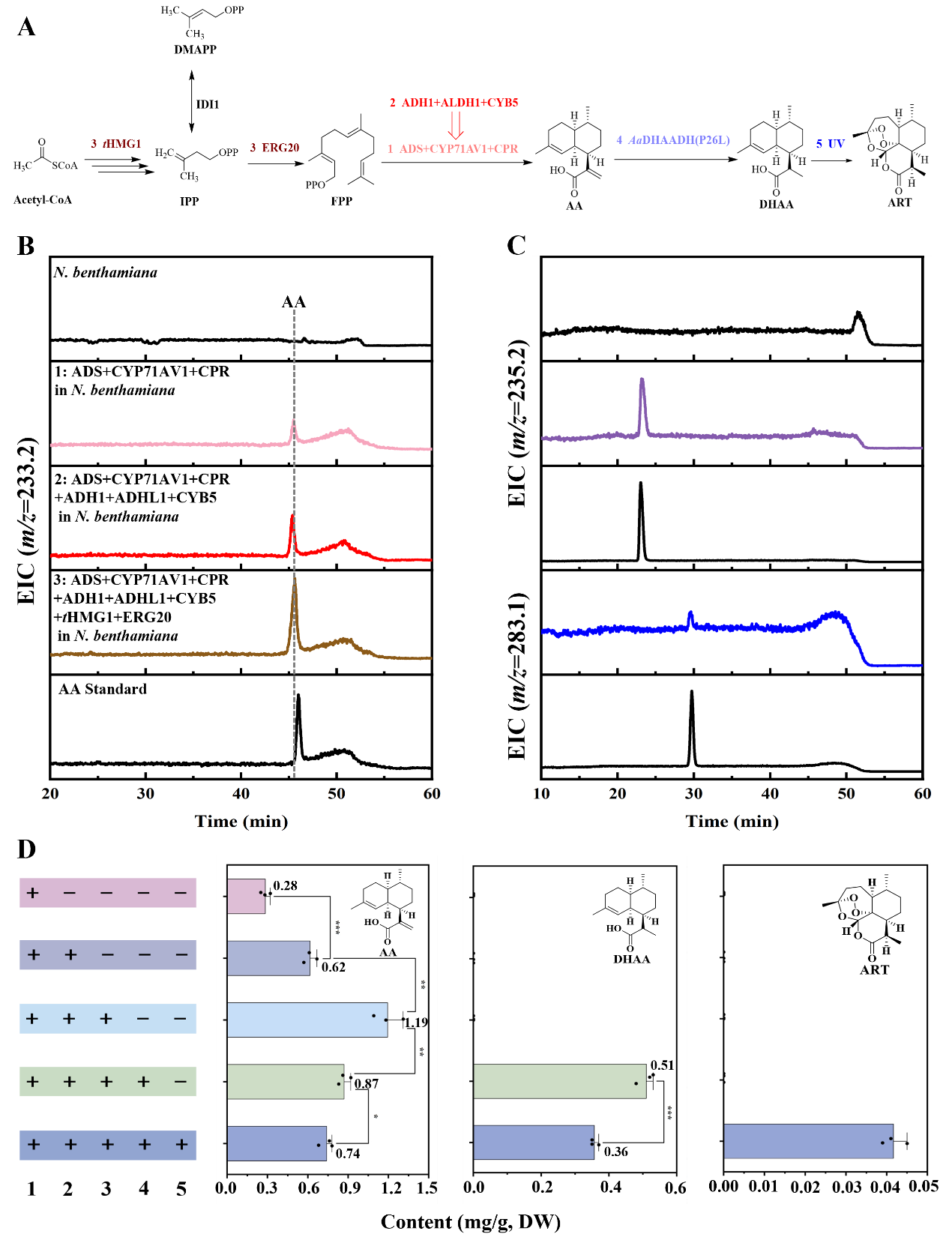 A:在本氏煙草中ART的生物合成線路圖;B:在本氏煙草中瞬時表達關鍵酶生產AA的LC-MS檢測(m/z=233.2);C:在本氏煙草中瞬時表達關鍵酶生產DHAA(m/z=235.2)和ART(m/z=283.1)的LC-MS檢測;D:不同基因組合侵染處理的煙草葉片中產物AA、DHAA和ART的含量。