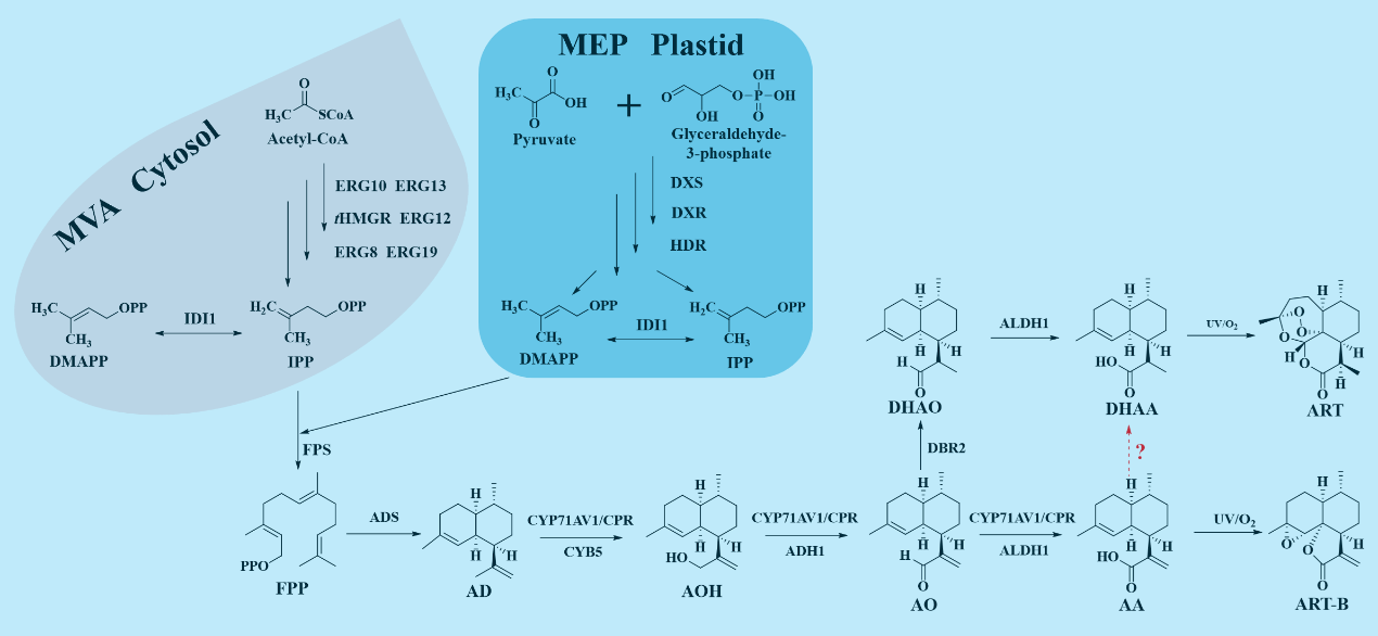 2006年,D.K.Ro等人首次實現(xiàn)工程化酵母菌株發(fā)酵生產青蒿酸(Artemisinic acid,AA)——抗瘧疾藥物青蒿素(Artemisinin,ART)的前體化合物,開啟了采用合成生物學方法生產青蒿素類化合物(Artemisinins,ARTs)的新篇章。