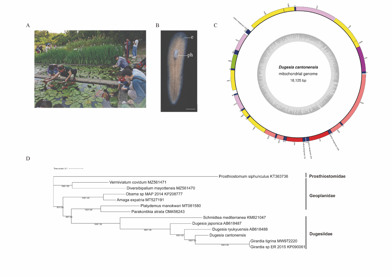 長期以來,全球實驗室廣泛研究的渦蟲品系主要為地中海渦蟲(Schmidtea mediterranea)和日本三角渦蟲(Dugesia japonica),在我國本土發(fā)現(xiàn)并實現(xiàn)大規(guī)模培養(yǎng)的品系較為罕見。研究團隊通過形態(tài)學、分子系統(tǒng)發(fā)育學、染色體核型、線粒體全基因組測序等方法(見下圖),最終確認廣州三角渦蟲為一個獨立的新物種,這一源自廣州本土的重要發(fā)現(xiàn),豐富了渦蟲生物多樣性寶庫。同時,由于渦蟲生活在潔凈水體,營自生生活,這一發(fā)現(xiàn)也進一步標志著廣州市在生物多樣性保護和生態(tài)環(huán)境建設方面卓有成效。