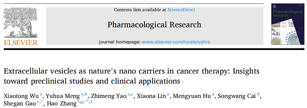 暨南大學融媒體中心訊 近日,暨南大學基礎醫(yī)學與公共衛(wèi)生學院腫瘤精準醫(yī)學和病理研究所張灝教授團隊指導臨床醫(yī)學專業(yè)本科生吳曉桐以第一作者身份在國際主流學術雜志Pharmacological Research(藥學1區(qū)、藥理學Top期刊、影響因子10.5分)發(fā)表了題為Extracellular vesicles as nature's nano carriers in cancer therapy: Insights toward preclinical studies and clinical applications的綜述。