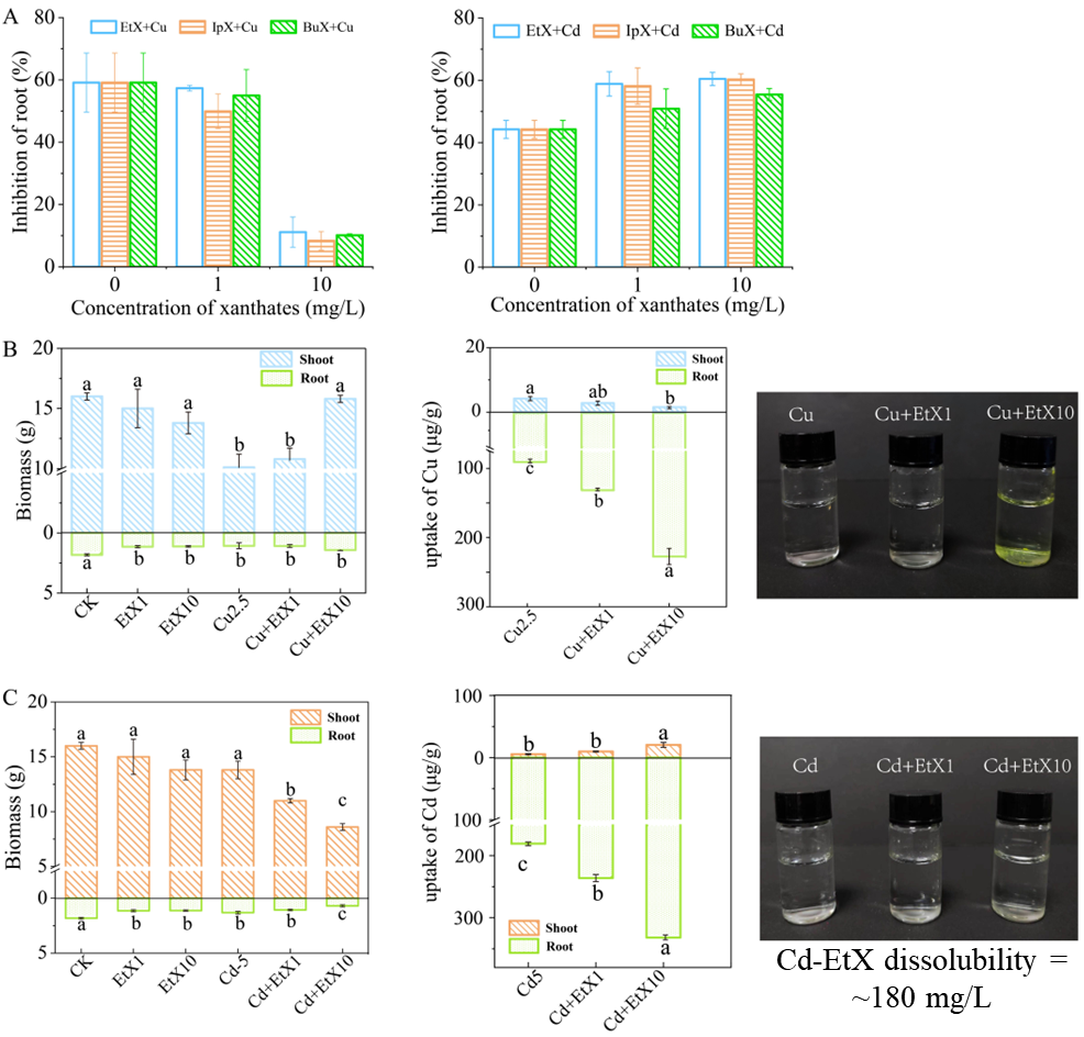 研究發(fā)現(xiàn),3種黃藥均能與Cd發(fā)生絡合反應,形成可溶性的三齒配位絡合物,呈現(xiàn)對稱三角錐形結構,其配位作用涉及4個σ鍵和1.5個π鍵。該配位成鍵機制糾正了以往認為黃藥與Cd形成二齒配位絡合物的錯誤觀念。Cd-黃藥絡合物的形成抑制了黃藥的降解,從而增強其在環(huán)境中的持久性。而且該絡合物的形成還顯著增加了Cd的生物有效性,導致白菜幼苗中Cd的積累量較單一暴露下增加了2.8倍;并通過抑制電子傳遞、氣孔導度和蒸騰速率等機制破壞了作物光合作用和蒸騰作用,造成白菜幼苗出現(xiàn)嚴重的膜脂過氧化損傷及生物量大幅損失。值得注意的是,與Cd不同,銅(Cu)和3種黃藥均形成不可溶的絡合物沉淀,導致毒性顯著降低。這與Cu-黃藥絡合親和力(pKsp=~20)遠大于Cd-黃藥絡合親和力(pKsp=~14)有關,表明黃藥與具有中等親和力的金屬會形成可溶性的黃藥配合物,從而產生顯著的協(xié)同毒性作用。這些發(fā)現(xiàn)為認識有機選冶藥劑與重金屬的互作提供了全新的見解,對于開展相關污染治理工作及保障生態(tài)環(huán)境安全和人體健康具有重要意義。
