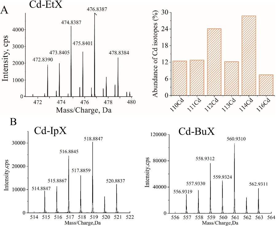 圖 3  Cd-EtX的高分辨率質譜(HRMS)以及Cd同位素的自然豐度(A)以及Cd-IpX(B)和Cd-BuX(C)的HRMS譜