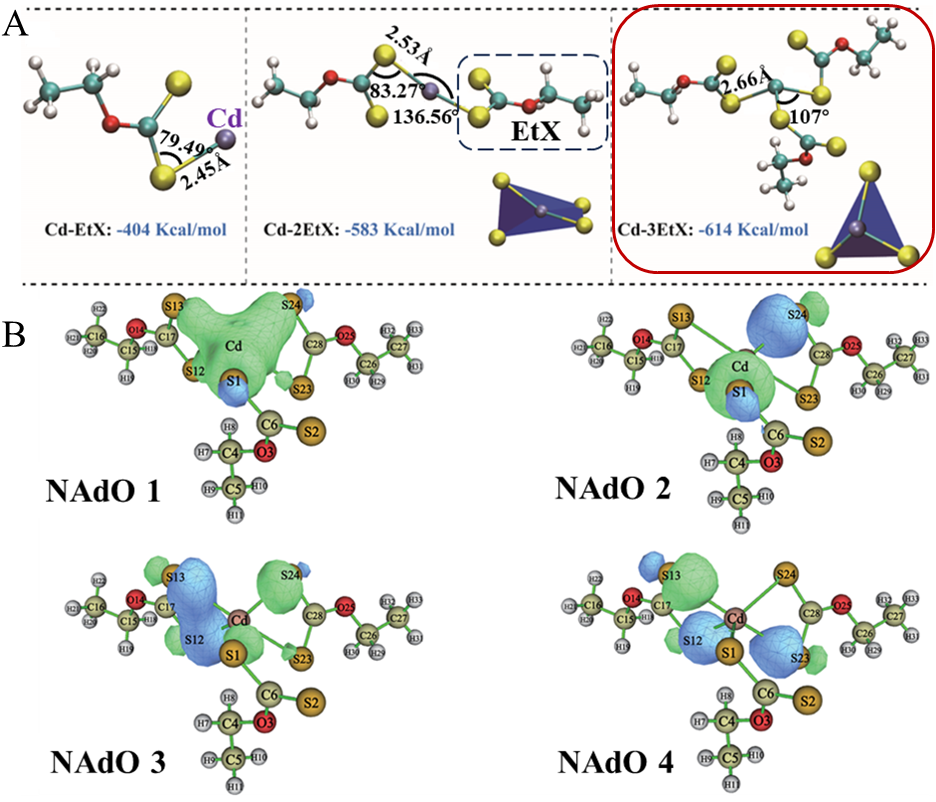 圖5 不同配位數Cd-EtX絡合物的構象分析(A)、三齒EtX-Cd配合物鍵軌道的等值面(等值線=0.05)(B)