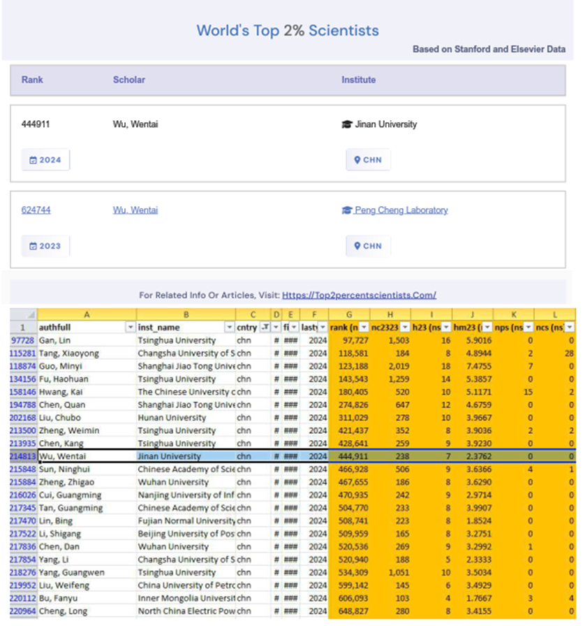 圖 我院青年教師吳文泰(Wu, Wentai)連續(xù)兩年入選top 2% scientists榜單,且分布式計算領(lǐng)域內(nèi)最新年度排名為中國籍第10