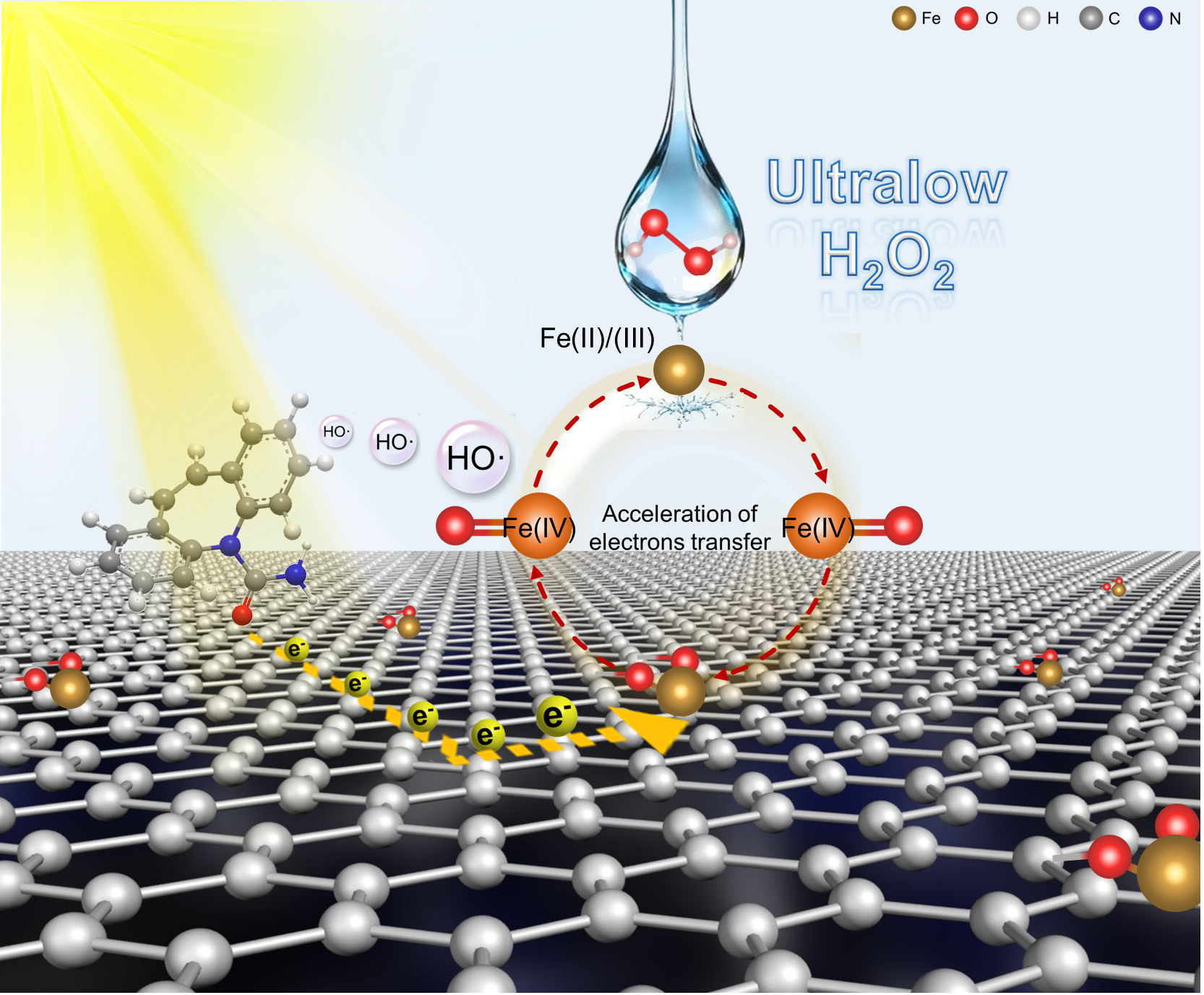 該研究設計了一種具有Fe─O─C構型的單原子鐵/氧化石墨烯(Fe1-GO)催化劑,在可見光照射下,僅需投加微量過氧化氫(H2O2),即可實現(xiàn)污染物的高效降解和H2O2的原位再生。與傳統(tǒng)芬頓及類芬頓工藝需持續(xù)投加高劑量H2O2不同,本研究提出的系統(tǒng)在僅使用2?mM H2O2,連續(xù)四個循環(huán)中對卡馬西平(CBZ)的去除率均保持在95%以上,H2O2利用效率接近100%。實驗結合DFT計算結果表明,H2O2在Fe1-GO表面觸發(fā)Fe(IV)=O活性物種形成,促進污染物電子向活性中心轉移,反應過程可同時實現(xiàn)H2O2的原位再生與自補充。