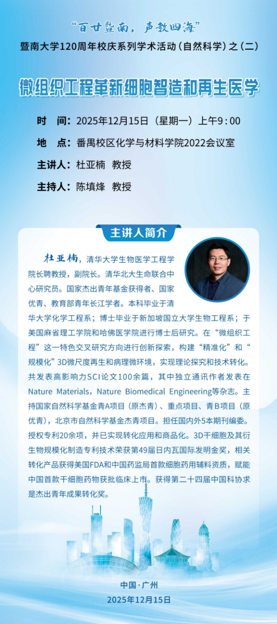 【百廿暨南,聲教四?!啃c系列學(xué)術(shù)活動(dòng)(五)——杜亞楠:微組織工程革新細(xì)胞智造和再生醫(yī)學(xué)