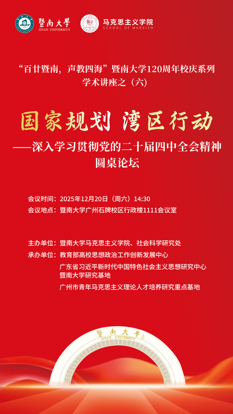 【百廿暨南,聲教四?!啃c系列學(xué)術(shù)活動(dòng)(六)——國(guó)家規(guī)劃·灣區(qū)行動(dòng)-深入學(xué)習(xí)貫徹黨的二十屆四中全會(huì)精神圓桌論壇