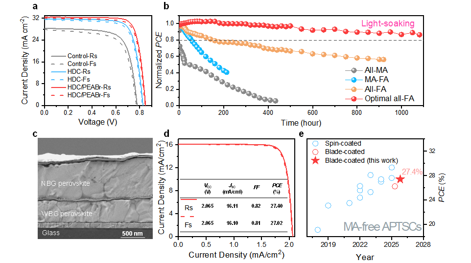 物理與光電工程學(xué)院麥耀華/郭飛課題組在Energy Environ. Sci.期刊上發(fā)表涂布印刷全鈣鈦礦疊層太陽電池研究成果